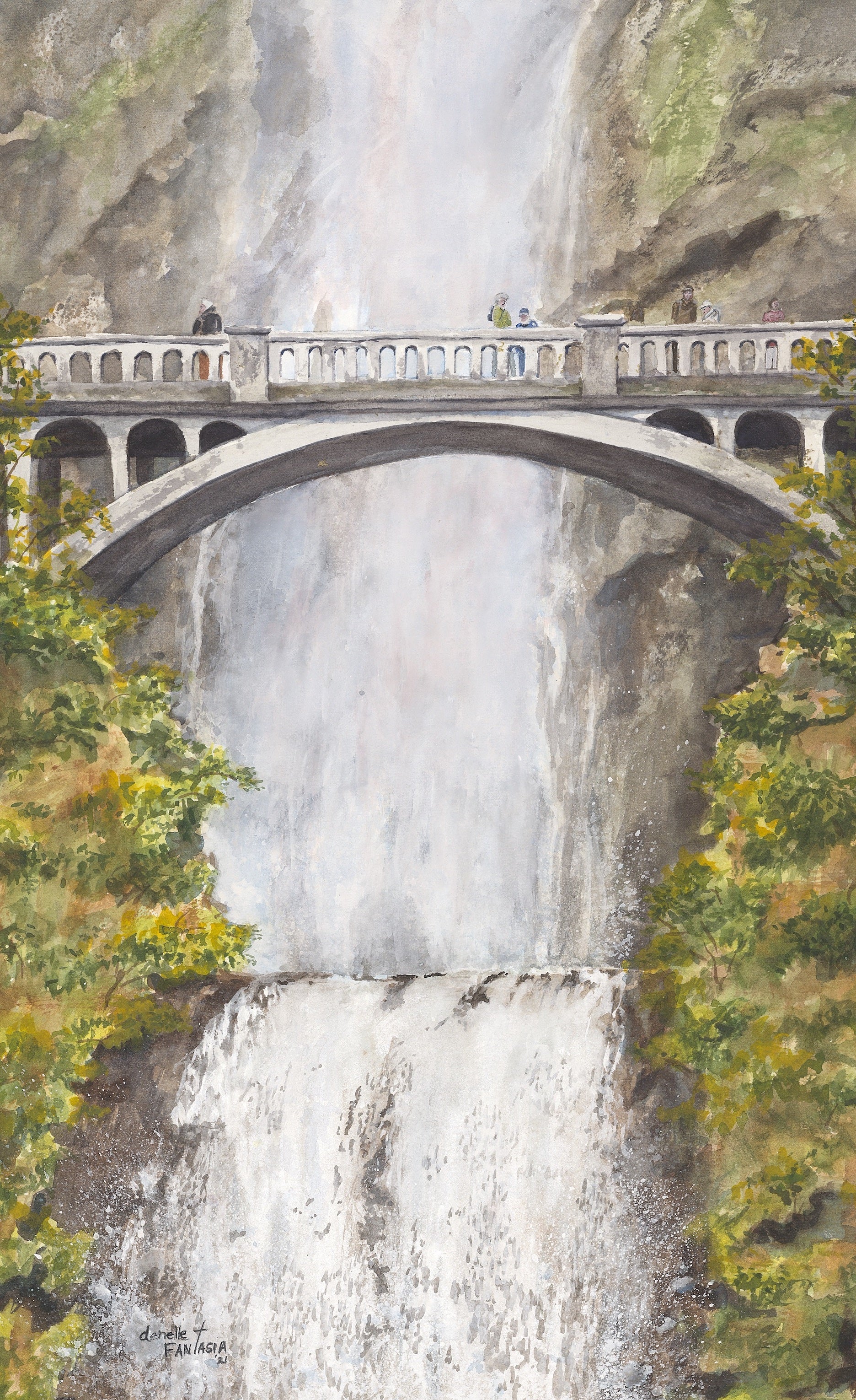Multnomah Falls, Oregon. A favorite landmark on the way to visit family. I had fun pouring and splattering paint on this watercolor.